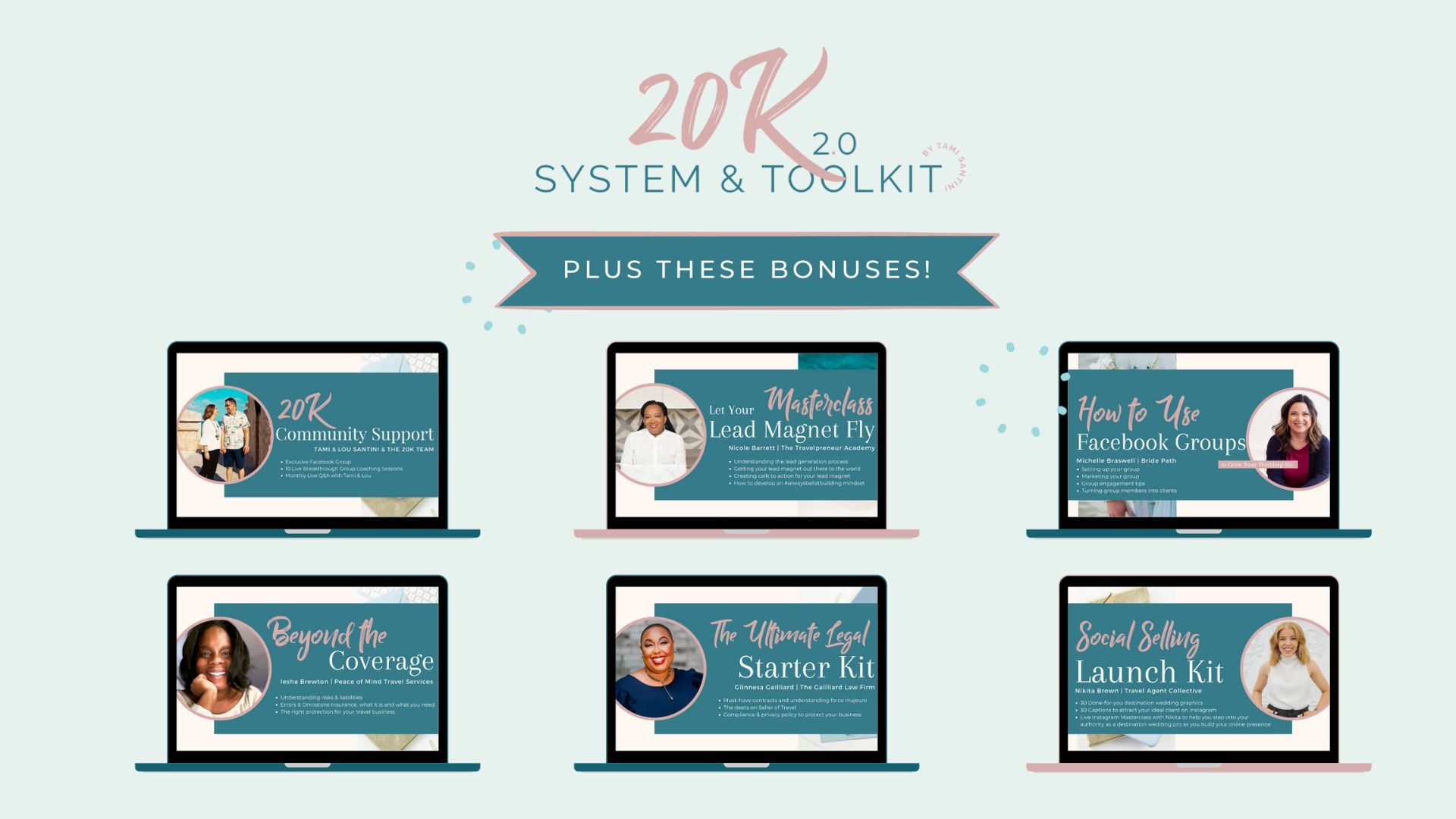 The 20K System & Toolkit gives you the exact plan to start adding & multiplying your destination wedding & honeymoon bookings! So you can confidently ignore all other distractions that try to pull you in one direction or another.