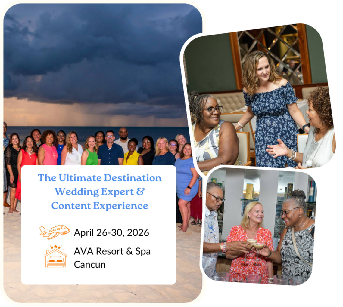 We’ll guide you step by step in creating content, messaging, and positioning that instantly elevate your credibility. Walk away with the "inside information" and the confidence to attract high-value destination weddings, honeymoons, vow renewals, anniversaries, and many other types of travel for your leads and clients all year long.